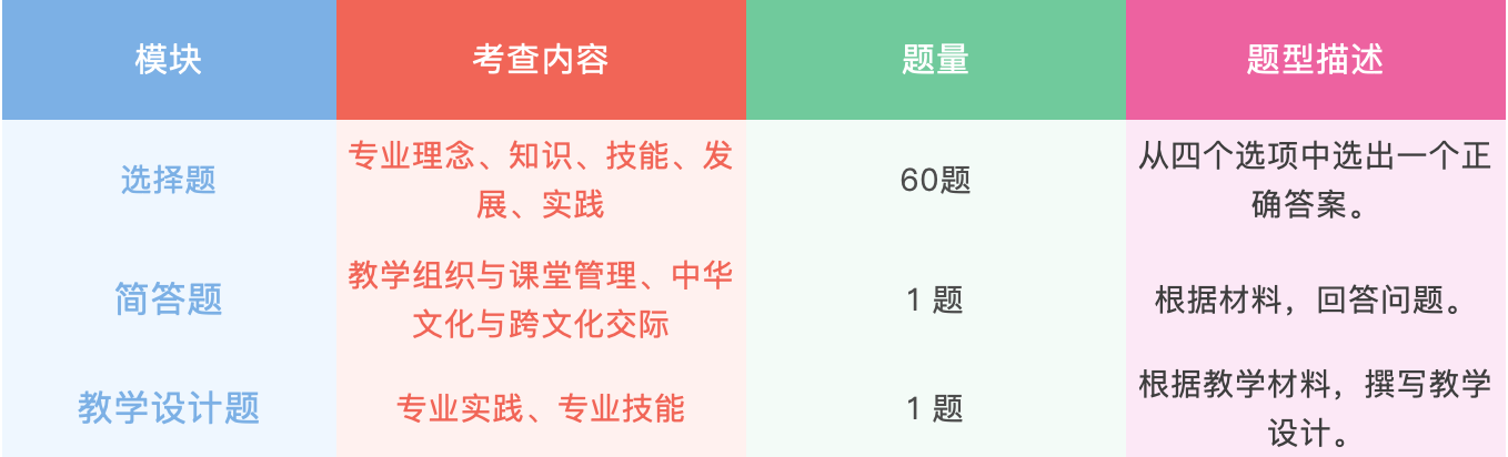 笔试全部为客观题与主观题相结合的考查形式,共62题,考试时间100分钟,分为三大模块,试题以案例导入式设计,贴合教学实际: